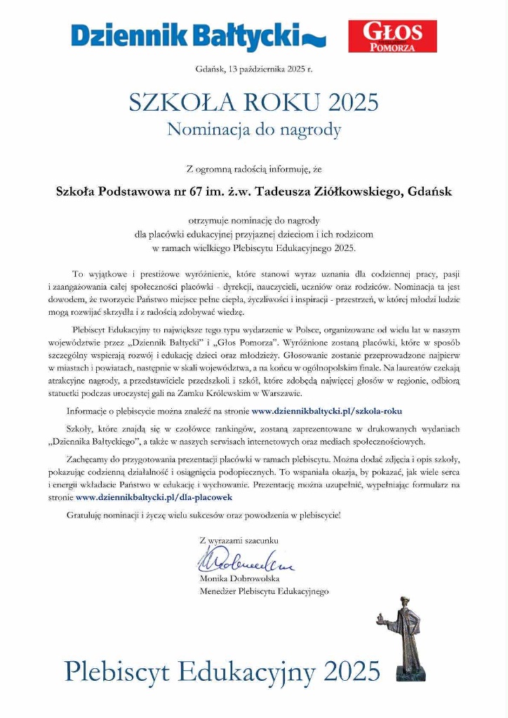Z radością informujemy, że nasza szkoła została nominowana do udziału w Plebiscycie Edukacyjnym 2025 w kategorii Szkoła Roku organizowanym przez Dziennik Bałtycki!
